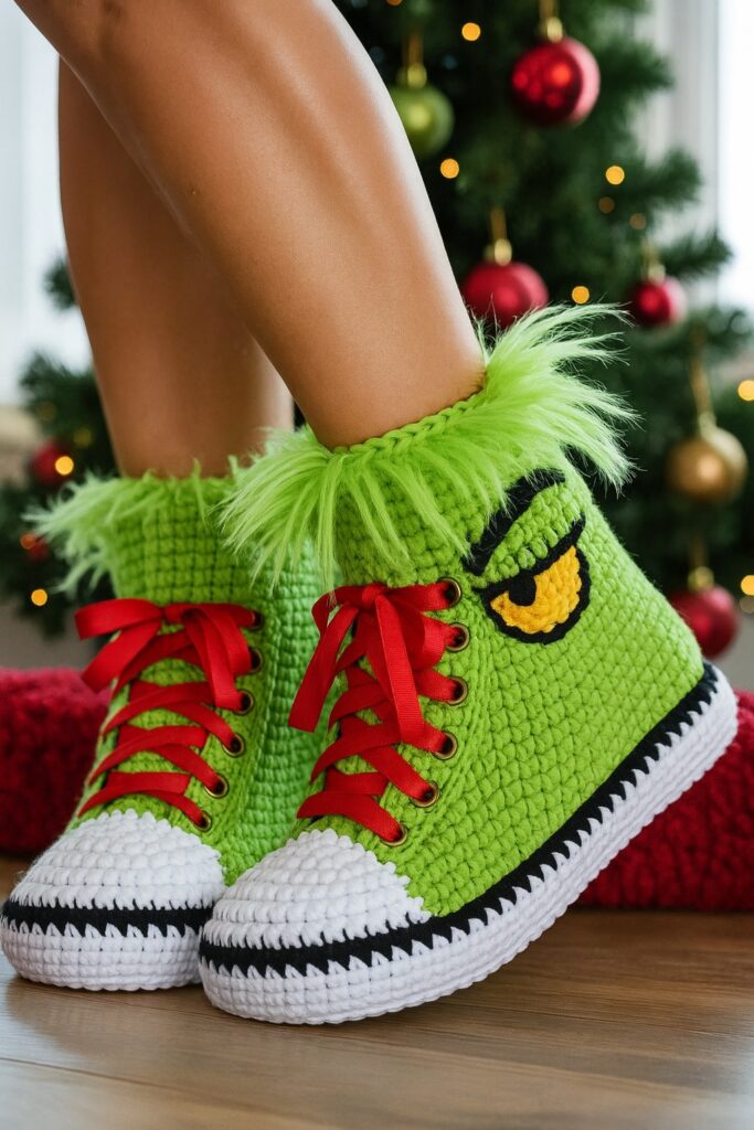 The Grinch Sneaker Slippers – FREE Crochet Pattern is a fun and festive project that brings holiday spirit right into