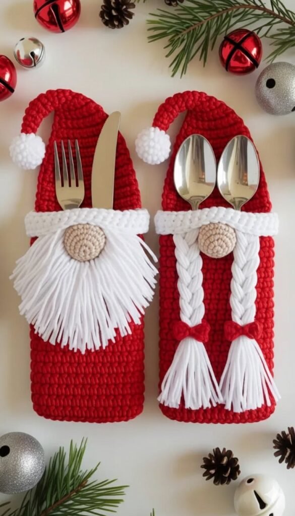 Crochet Christmas Gnome Cutlery Holders Pattern is a delightful and festive craft project that brings charm, color, and personality to