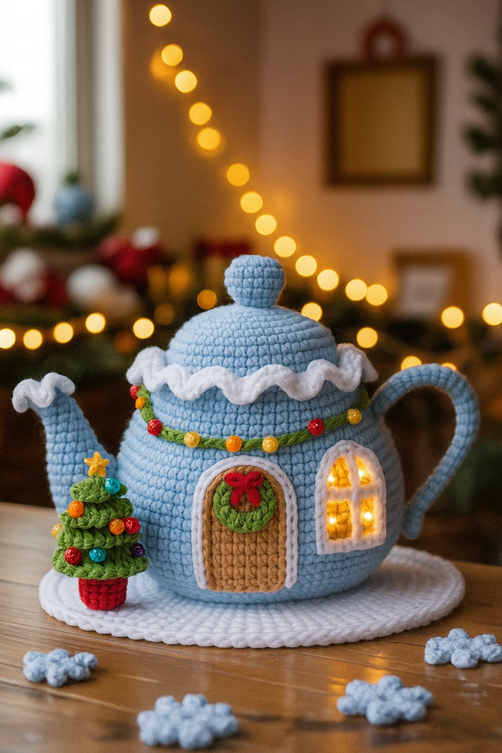 Another creative idea is to use the teapot house as part of a larger Christmas village display. Combined with other handmade items like crocheted trees or snowmen, it creates a magical holiday scene.