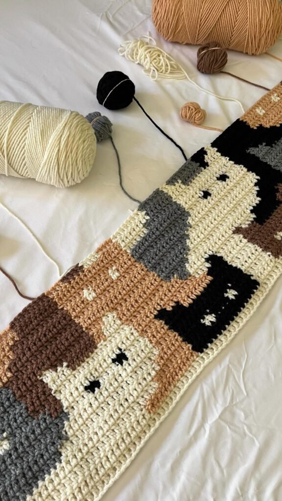 Graph-style designs are another option. A Crochet Afghan Cat Blanket built from a color chart can display full cat silhouettes or playful repeating shapes across the surface.