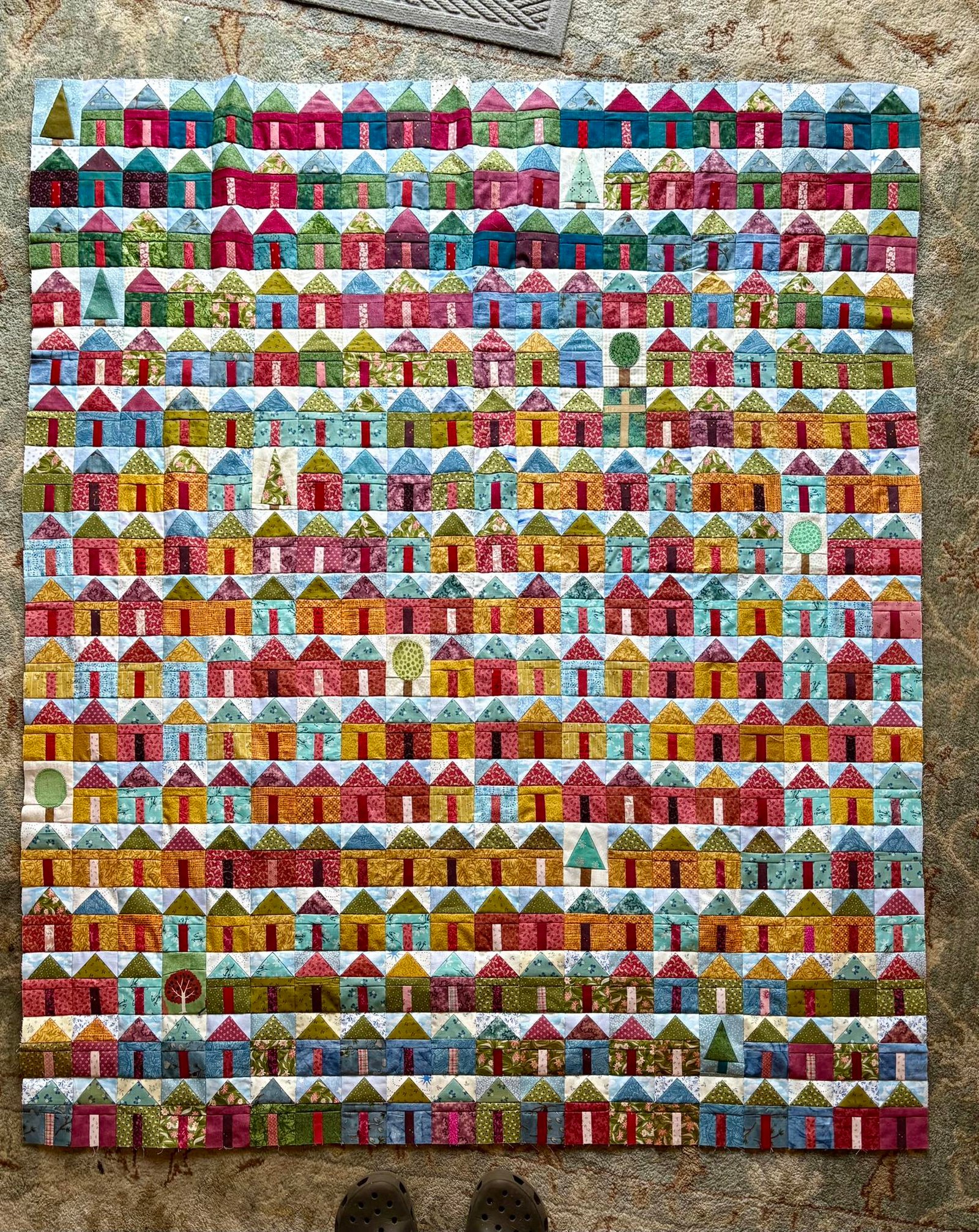 One of the strengths of this pattern is that it uses fabric efficiently. The straight-line seams and consistent block dimensions reduce fabric waste and make cutting faster. With well-chosen color combinations, the houses and trees can appear layered, creating depth without complicated piecing techniques.